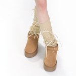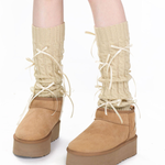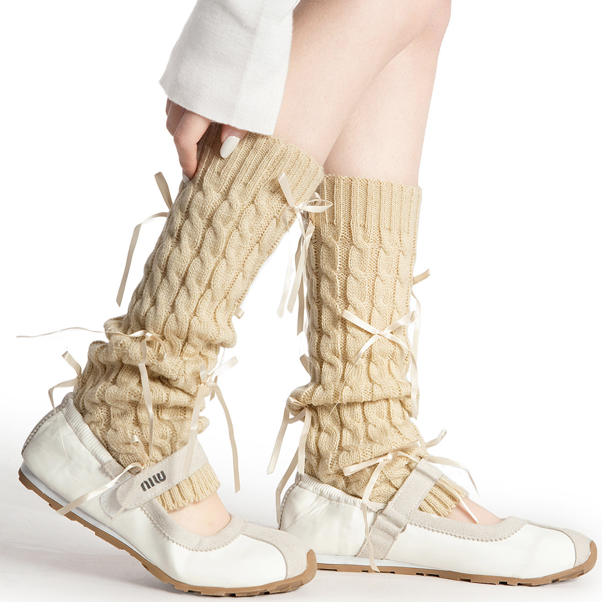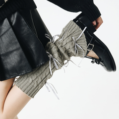 Add a soft, feminine finish to any outfit with these ribbon cable knit leg warmers, designed in a cozy slouchy fit that layers beautifully over loafers, sneakers, ballet flats, and boots. Featuring a textured cable knit design with delicate bow accents throughout, these cute leg warmers bring the perfect coquette, balletcore, and kawaii-inspired touch to your wardrobe while keeping your look warm and stylish. Easy to dress up or down, they pair effortlessly with miniskirts, dresses, shorts, and oversized sweaters for a chic everyday outfit. Available in 5 versatile colors: ivory, beige, black, grey, and camel. These aesthetic knit leg warmers are a must-have accessory for creating trendy, playful, and effortlessly girly looks all season long.