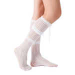 Prepare for a dreamy journey alongside Chloe! These white semi-sheer socks are the ideal choice for infusing a hint of romance into your outfit. Featuring a three-layered delicate lace trim in a knee-high silhouette, embellished with a charming satin bow that adds a touch of sweetness. The subtle striped pattern, woven with glistening metallic threads adds a bold twist. Crafted from a supple blend of nylon and spandex, they feature an elastic collar that ensures a snug fit. Whoever said we couldn't embrace both romance and adventure in the year ahead? 💕
