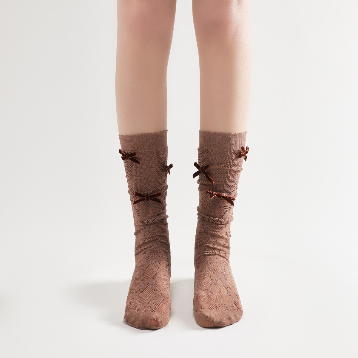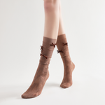 Gabriella 3D Bow Ribbon Applique Lace Crew Sock | Mocha