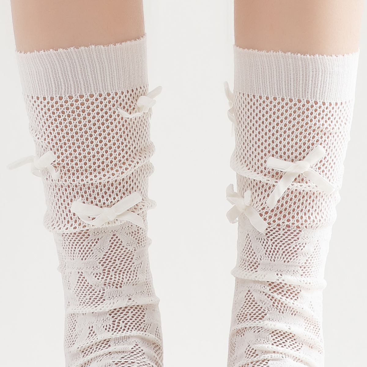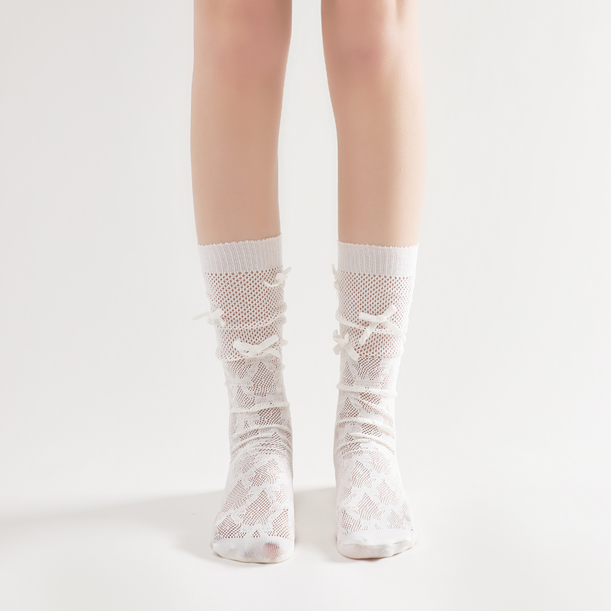 Handle with care when slipping on and off to prevent the bow from detaching. The styling of socks as mid calf socks varies based on an individual's height.