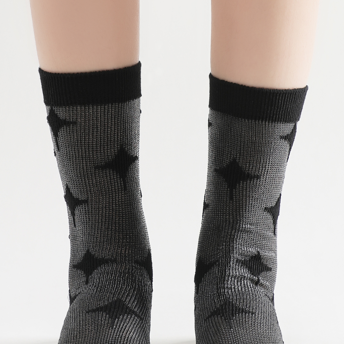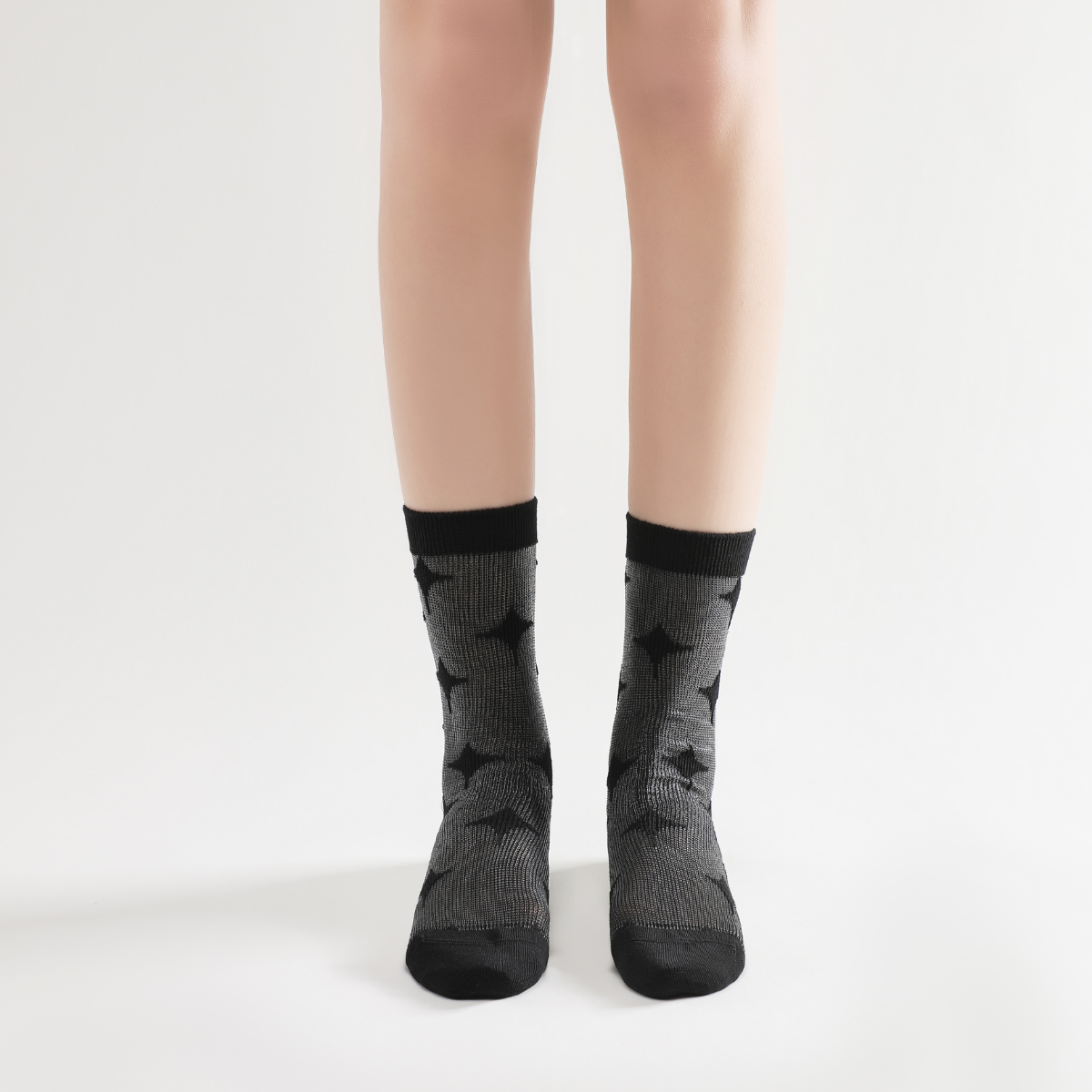 Blast off into cozy cuteness, babe. The Stella Star socks are your go-to for when you wanna feel soft, sparkly, and just a little bit cosmic. With a dreamy semi-sheer base, glittery star appliqués, and a comfy elastic cuff, these socks don’t just complete the look—they are the look. Warning: may cause spontaneous compliments.