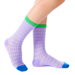 Inject some fun into your day with our Zoe color block pointelle socks! These socks will make you feel like your most comfortable self, while giving your outfit the perfect pop of color. The soft pointelle knit and trendy dopamine shade will have you feeling on top of the world. Featuring a solid purple base with a contrasting toe and elastic cuff, these socks are a must add to your sock collection.