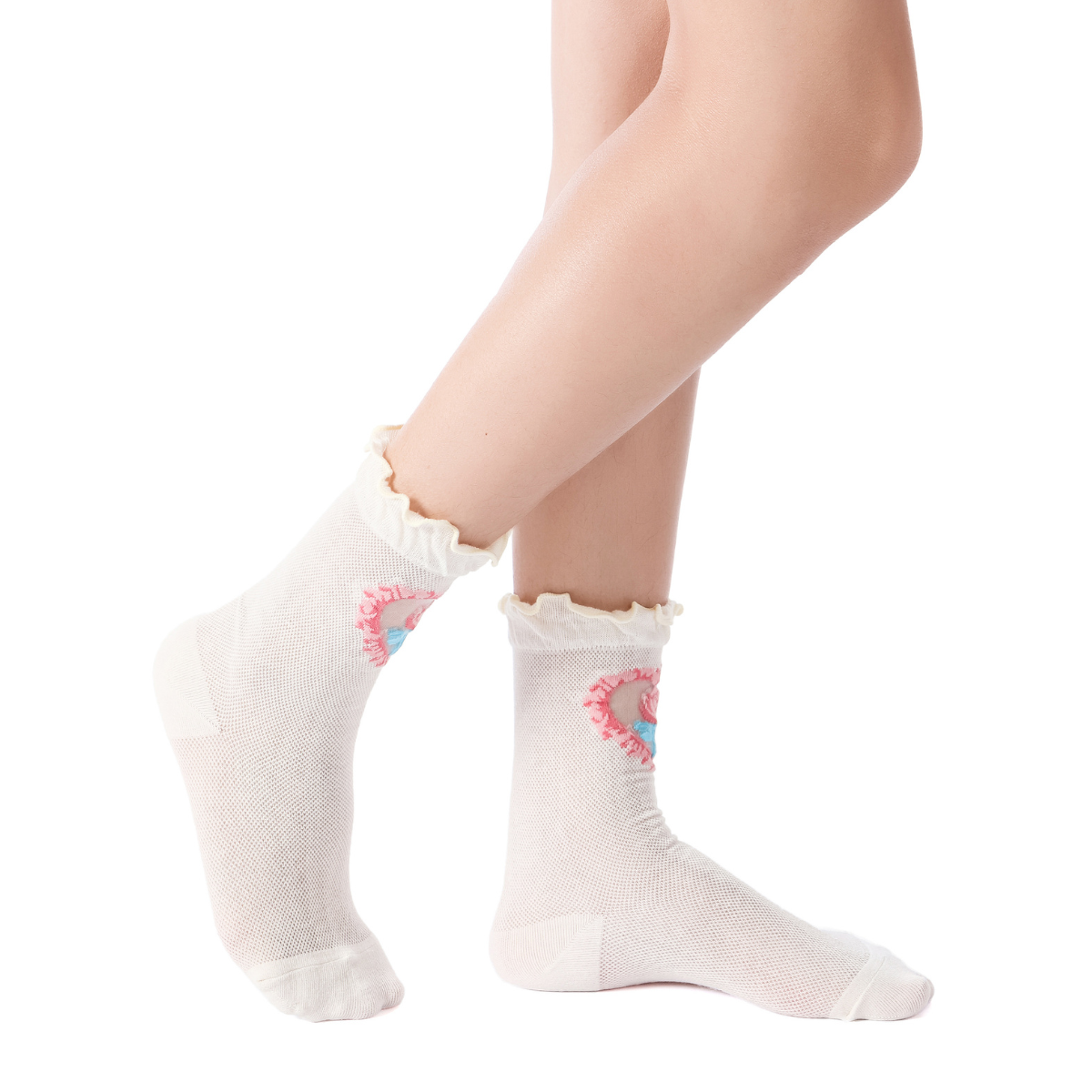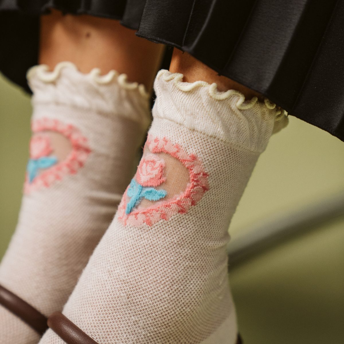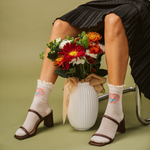 Embrace your inner art lover with our La Fleur Sheer Floral Jacquard Mesh Crew Socks. These Limited Edition socks draw inspiration from classic Rococo still-life paintings, featuring a refined jacquard rose design on a sheer fabric that playfully reveals a glimpse of skin.